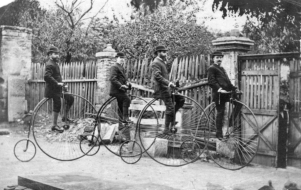 A magyar kerékpársport úttörői 1880. körül: Günther Antal jogász, újságíró, Forché Roman fényképész, Kosztovics László, valamint Vermes Lajos földbirtokos