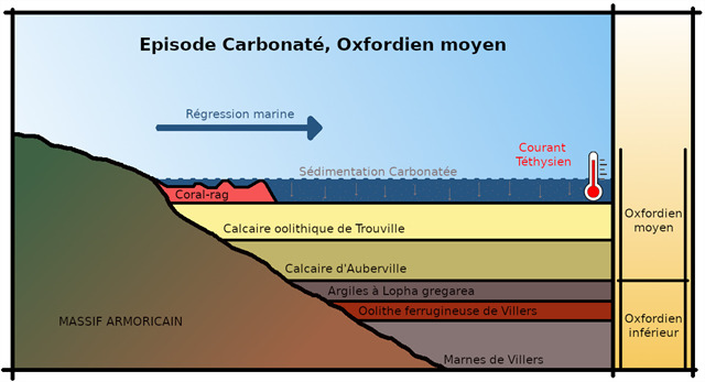 2 - LâOxfordien moyen : Les courants se modifient, ainsi ce sont les eaux provenant de lâocĂ©an TĂ©thys qui remontent sur le bassin parisien. La tempĂ©rature de la mer se rĂ©chauffe, et la sĂ©dimentation devient majoritairement calcaire. Peu Ă peu le socle calcaire remplit le bassin et vers la fin de l'Oxfordien moyen, sous un climat tropical, plusieurs petits rĂ©cifs coralliens se dĂ©veloppent sur des hauts fonds formĂ©s par les sables oolithiques, Ă lâest du rivage armoricain. Ainsi, du nord au sud, se succĂšdent les rĂ©cifs du Mont Canisy, de la Roque-Baignard et du secteur de Mortagne-au-Perche.