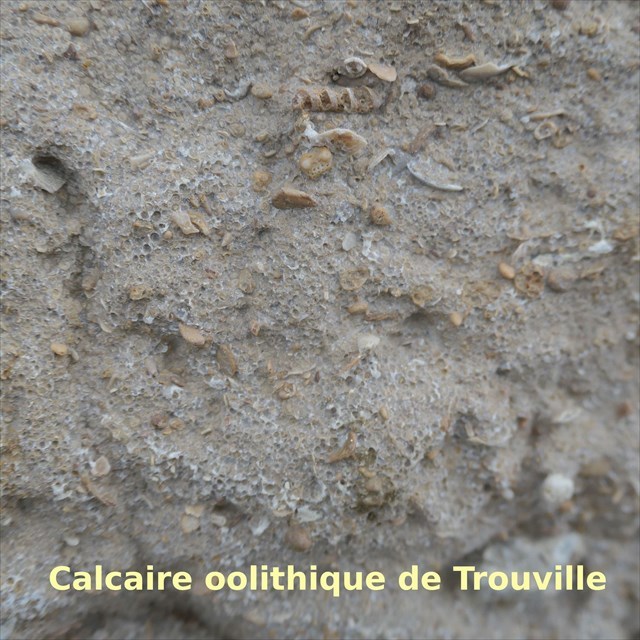 Les glissements anciens ont Ă©galement entraĂźnĂ© le panneau calcaire oolithique de Trouville sous-jacent au Coral Rag. Ainsi la formation du Calcaire oolithique de Trouville est exposĂ©e en bas du versant, sous lâancien blockhaus. Ce calcaire prĂ©sente une forte densitĂ© dâoolithes calcaires blanches au milieu desquelles sont dispersĂ©s des bioclastes de taille variĂ©e. Dans certains blocs, lâaccumulation de bioclastes indique que le milieu de sĂ©dimentation, alors peu profond, pouvait ĂȘtre soumis aux tempĂȘtes. Parmi ces bioclastes, on peut observer des valves de pectinidĂ©s, des petites huĂźtres de type Nanogyra, des encroĂ»tements de serpules, des coquilles de bivalves et des radioles dâoursins.