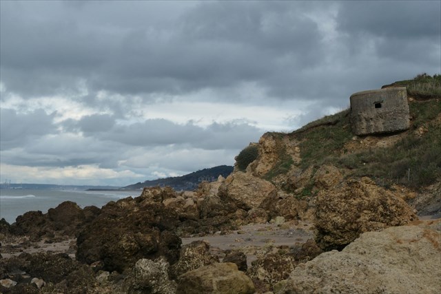Ancient landslides also resulted in the Trouville oolitic limestone panel underlying the Coral Rag. Thus the Trouville Oolitic Limestone formation is exposed at the bottom of the slope, under the old blockhouse. This limestone has a high density of white calcareous oolites in the middle of which bioclasts of varying sizes are scattered. In certain blocks, the accumulation of bioclasts indicates that the sedimentation environment, then shallow, could be subject to storms. Among these bioclasts, we can observe scallop valves, small Nanogyra type oysters, serpula crusts, bivalve shells and sea urchin radioles.