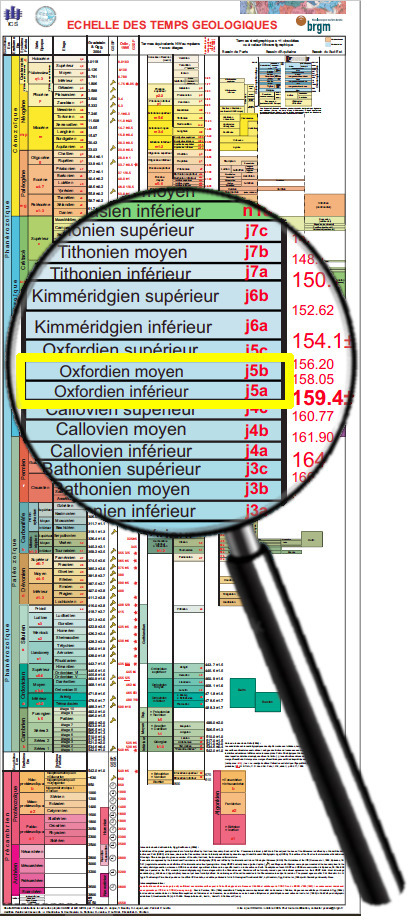 The Oxfordian is the first stratigraphic stage of the Upper Jurassic (Malm). It extends from -163.5 to -157.3 million years ago. Its duration is approximately 6 million years. At that time, the sea covered a large part of Europe. The emerged lands, made up of the remains of the Hercynian chain, form an archipelago. Thus, the Armorican massif is an island and the Paris basin a sea. Oxfordian is divided into three sub-levels.