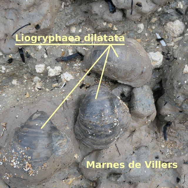 The Villers Marles date from the Lower Oxfordian. The sediments that make up the marls come from the erosion of the Armorican massif. The clays and silts are deposited on calm muddy bottoms, open to both continental (bones of terrestrial vertebrates) and marine (ammonites and belemnites) influences. The benthic fauna of these mudflats is dominated by grypheas. The presence of ammonites with subboreal affinities (Cardioceras) indicates that the waters are cold (currents coming from the North Sea via submerged England). Subsidence favors the deposition of a large thickness of marl.