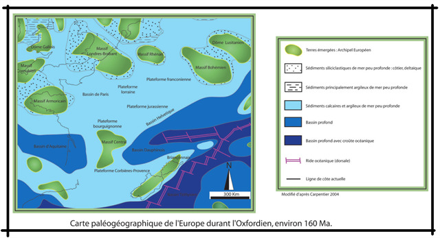 L'Oxfordien est le premier Ă©tage stratigraphique du Jurassique supĂ©rieur (Malm). Il s'Ă©tend de -163,5 Ă -157,3 millions d'annĂ©es. Sa durĂ©e est d'environ 6 millions d'annĂ©es. A cette Ă©poque, la mer recouvre une bonne partie de l'Europe. Les terres Ă©mergĂ©es, composĂ©es des restes de la chaĂźne Hercynienne, forment un archipel. Ainsi, le massif armoricain est une Ăźle et le bassin parisien une mer. LâOxfortien est divisĂ© en trois sous Ă©tages.