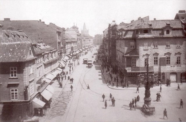 Až právě v průběhu 15. století byl zasypaný úsek příkopu mezi Můstkem a Havířskou ulicí zastavěn. Přední fasády domů lemovaly ulici Na Příkopě a zadní tvořily úzkou uličku, pojmenovanou podle zde provozovaného řemesla Provaznická. Krajní dům stojící u ústí Můstku a náležející už Koňskému trhu se nazýval Sklenářovský. V polovině 18. století byl jeho majitelem kupec a radní Jiří Karel Murarius z Naydorfu. Od roku 1794 pak patřil Petru Ceronimu.