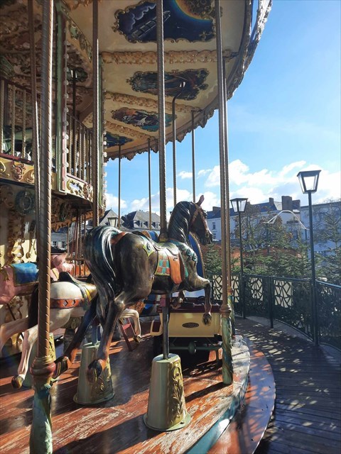 Partie facultative : juste à côté, grimpez sur les chevaux de bois et tournez manège.
