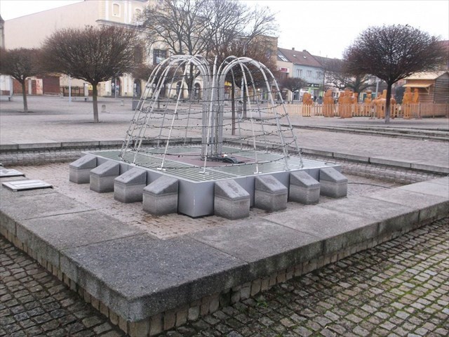 Fontána na námestí je v tomto období vyzdobené neonovými trubicami pre večerné svietenie