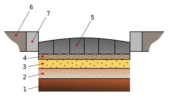 Für eine Römerstraße war immer Aushub bis über einen Meter in die Tiefe nötig, um den Grund (Nr. 1) zu sichern. Danach wurden mit groben Steinen (Statumen Nr.2), dann mit Kies (Rudus und Nucleus Nr. 3) und darauf mit Sand immer feiner werdende Schichten (Nr. 4) aufgebracht, bis die Fahrbahndecke mit Pflastersteinen (Nr 5.) auf eine vorgegebene Breite ausgeführt wurde. Randsteine (Nr. 7) formten Rinnen in die Konstruktion. Am Beispielfoto aus Pompeji ist schön zu erkennen, dass die Randsteine bzw. Fußwege höher gelegt wurden, damit das Wasser über die Fahrbahn abläuft.