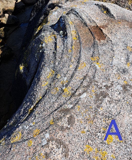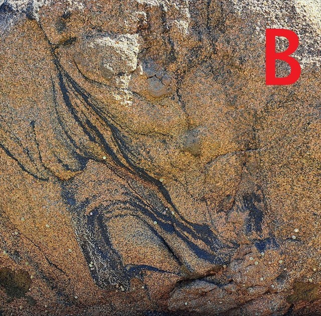 De part et d'autre de la plage de sable de Tourony, les rochers constitués de granite rose à gros cristaux montrent de nombreuses traînées sombres qui dessinent toute une variété de figures courbes évoquant dans tous les cas des structures d'écoulement magmatique.