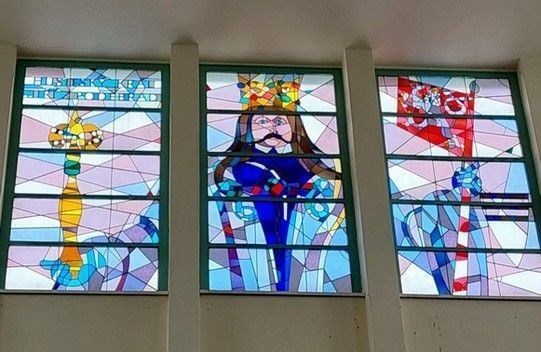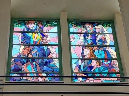 Dále pohleďte vzhůru na vitrážová okna. Vždy počítejte v obou oknech patřících k jednomu výjevu.