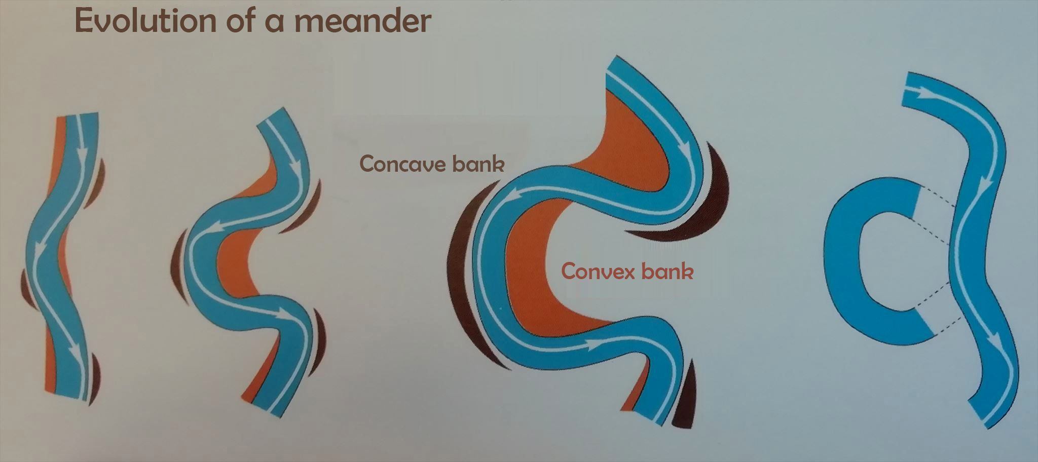 L’eau subit une force centrifuge qui la déporte vers l’extérieur et engendre une érosion régulière de la rive concave. Les berges de cette rive reculent et finissent par avoir un versant raide. Sur la rive opposée, la pente est plus douce et l’on observe des dépôts qui sont déposés par l’eau.
