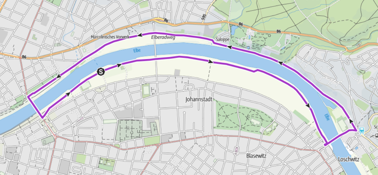 Los geht's! Der Start befindet sich beim Fährgarten Johannstadt und nun geht es immer an der Elbe entlang bis zum Blauen Wunder, auf der anderen Seite wieder zurück, bis zur Albertbrücke, wieder auf die Altstädter Seite und zurück zum Fährgarten. Auf dem Weg findet ihr Details, die ich auf einer Runde mit Co90 fotografiert habe. Eure Aufgabe ist, diese in die richtige Reihenfolge zu bringen und die Variablen für die Finalformel durch die Zahl der Position des Details auf der Laufstrecke zu ersetzen.