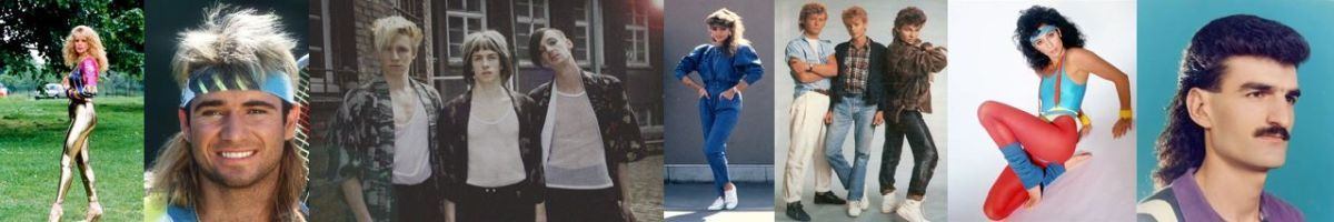 Vielen von uns werden aber vor allem die Modetrends in (schmerzhafter) Erinnerung bleiben … soll ich? Dauerwelle, Leggings, Stirnband, Netzhemden, Vokuhila, Lederkrawatte, Jeanshemd, Schulterpolster, Espandrillos, Fledermaus- und Puffärmel, John-Wayne-Hemden, Lacoste T-Shirt und das alles natürlich in Neonfarben.