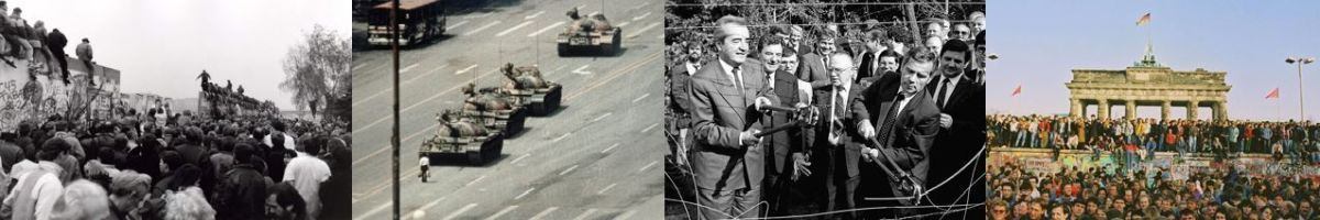 Am Ende obsiegen die Kräfte des Wandels … abgesehen von China, wo am Tian’anmen die Demokratiebewegung sanft einschläft … so die chinesische Version. In Europa allerdings fällt der Eiserne Vorhang … durch die Hand von Alois Mock … und die Berliner Mauer … die laut Walter Ulbricht ja ohnehin nie gebaut wurde.
