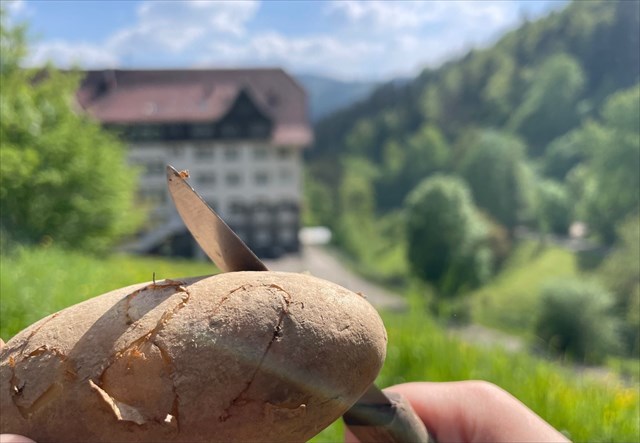 Now comes the tricky part: In addition to your face or GC nickname, your log photo must also show an object that plays an important role in the series. A little research beforehand (all episodes are available for free in the ZDF Mediathek; often a brief look at the title is enough if you don't want to watch the series) can't hurt. In your log, please explain how the chosen object is connected to the series. My example below shows a potato based with reference to the episode “The Stranger in the Cabin“(scene from minute 13). It is not enough to simply photograph a pair of trousers because all the actors (usually) wear trousers.
