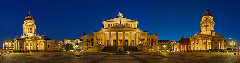 The Gendarmenmarkt is a square in the Berlin district of Mitte, named after the cuirassier regiment Gens d'armes, which was originally based here. Created during the city expansion in 1688, it was destroyed in the Second World War and rebuilt between 1976 and 1993. It is home to the Schauspielhaus (built between 1818 and 1821) by Karl Friedrich Schinkel, which is now used as a concert hall, and the German and French Cathedral by Carl von Gontard. The Gendarmenmarkt is considered the "most beautiful square in Berlin".