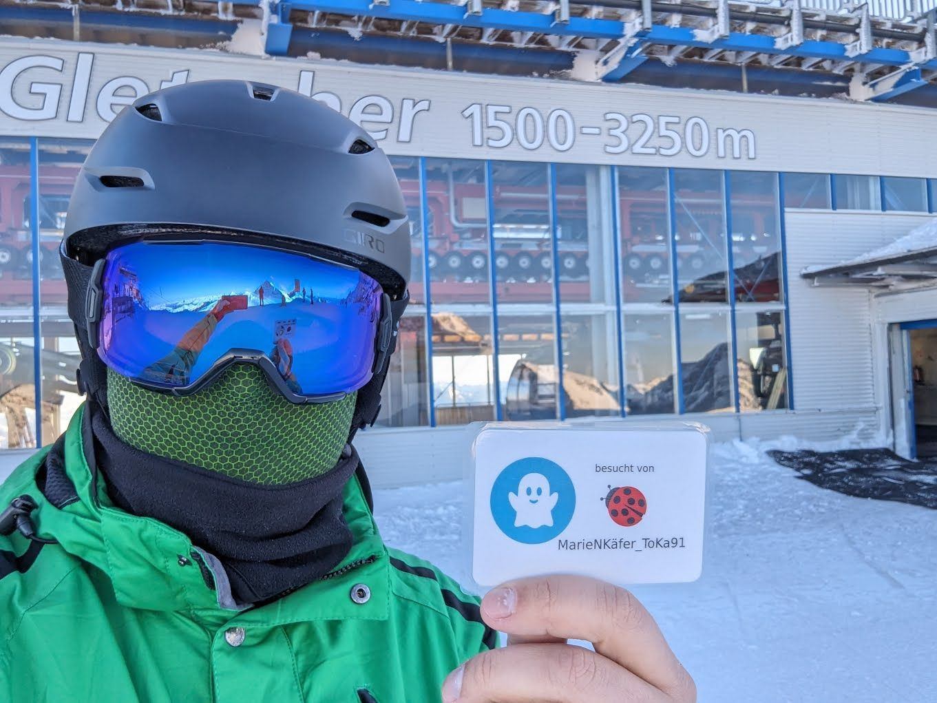 If the panorama terrace is closed, please take a photo in front of the Gletscherbus 3 mountain station showing the following things together and attach it to your log: