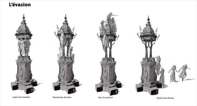 « Depuis 150 ans, les quatre cariatides des fontaines Wallace ont été sommées d’incarner Bonté, Charité, Simplicité et Sobriété, et de porter un dôme sur leurs épaules afin d’étancher la soif des habitants des villes, privés de la rivière d’eau fraîche depuis longtemps disparue. Mais aussi noble et vertueux que soit ce rôle, elles ne l’avaient ni choisi ni désiré. Alors, comme tant d’autres femmes à travers le monde et à travers le temps, les quatre cariatides des fontaines Wallace ont patiemment organisé leur évasion…
