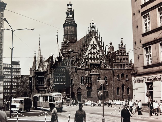 Wrocław has the oldest electric tram system in Poland. It started in 1877 with a monorail horse tram. From 1893 they were slowly replaced by electric trams, supplemented by a narrow-gauge railway to Trzebnica. All lines passed through the Market Square, which served as the city's communication center, from 1943 each district had a connection to the Market Square and the Main Railway Station. Trams disappeared from the Market Square in the late 1970s, when traffic was transferred to the W-Z Route. The symbol of Wrocław are blue trams.