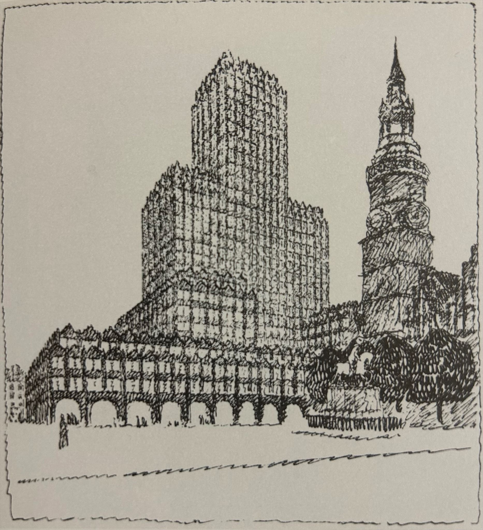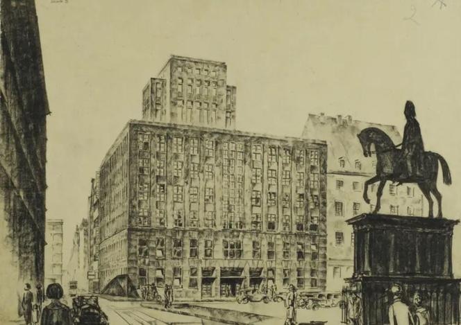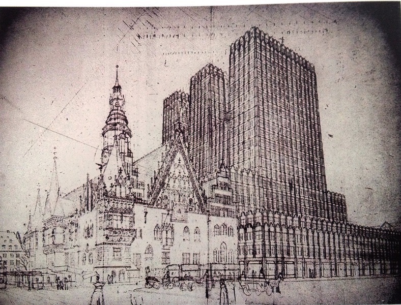 Wieżowiec na zachodniej pierzei Rynku nie pasuje do średniowiecznych kamienic? Modernistyczny budynek powstał po roku 1930, niedługo po sukcesie architektonicznym Hali 100-lecia Maxa Berga. Zaprezentowane powyżej projekty pokazują jak miasto o średniowiecznej historii miało się zamienić w żelazo-betonową pustynię zastępując wszystkie średniowieczne kamienice. Projektów na szczęście nie zrealizowano. Na uwagę zasługuje winda paciorkowa („ojcze nasz”) z 20 kabinami. Winda nie zatrzymywała się na piętrach, wsiadało się do niej wskakując i wyskakując w ruchu. Wejście główne z motywami sztuki egipskiej.