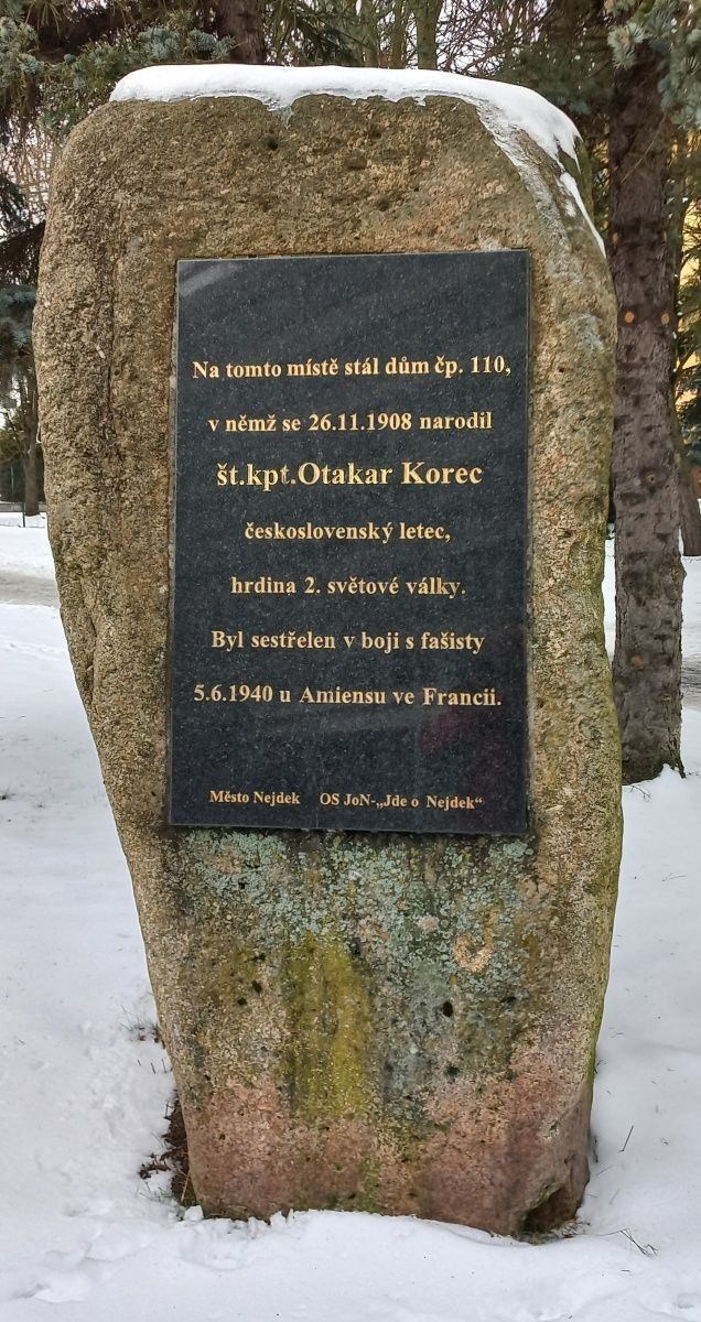 Po uplynutí 65 let ode dne, kdy byl Otakar Korec sestřelen při plnění bojového úkolu nedaleko Amiens, byl mu dne. 4. června 2005 v jeho rodném městě Nejdku odhalen kámen s pamětní deskou v místě, kde dříve stával jeho rodný dům.