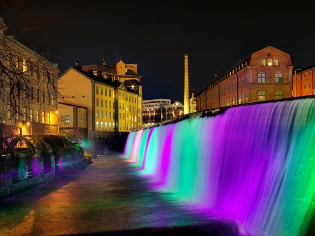 This is a virtual cache in Norrköping and Strömmen, at the broad waterfall, in the old industrial area.