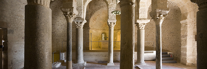 Debajo del ábside se encuentra la cripta de Sant Celoni. La puerta de acceso está en el muro sur y data de los siglos IX y X. Parece ser que las pinturas murales del ábside son del siglo VI, con una escena de Cristo rodeado de ángeles y, debajo, los doce apóstoles. Como las de Santa María, se encuentran entre las representaciones pictóricas murales más antiguas de Europa.