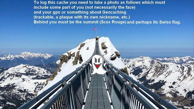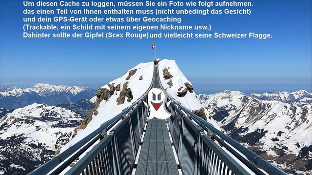 ăUm diesen virtuellen Cache an den Koordinaten zu bestĂ€tigen, mache ein Foto von dir (das Zeigen deines Gesichts ist optional) auf dem Steg mit deinem Nickname auf einem Blatt oder von einem persönlichen Gegenstand, der Geocaching darstellt, mit dem Gipfel (Scex Rouge) und vielleicht seiner Schweizer Flagge im Hintergrund, und fĂŒge es deinem Log beiă