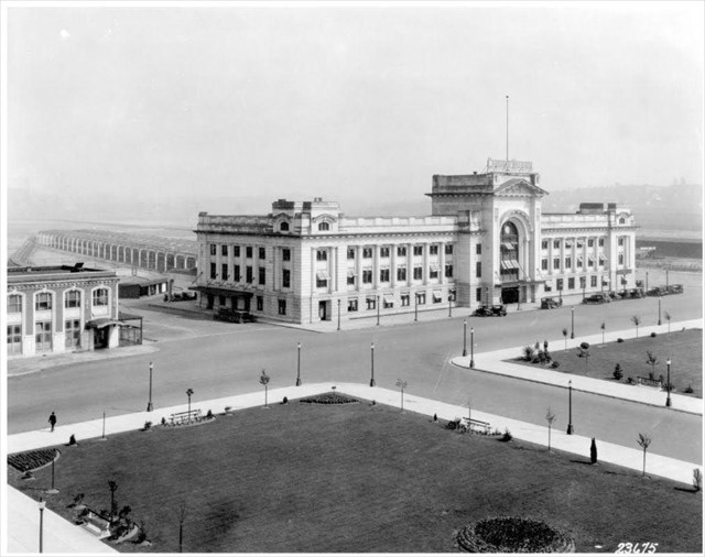 Erected between 1917-1919, this station was built as the western terminus for the Canadian Northern Railway. It is an excellent example of Neoclassical Revival Style design which was popular for train stations. The monumental central archway with an original steel frame canopy separates the symmetrical wings, ornamented with engaged columns and pilasters and a bracketed cornice. The station was built on reclaimed land that was originally part of False Creek. In 1993, the building was converted to a multi-modal transportation facility to accommodate both passenger railway and intercity bus travel. In addition a new bus concourse was built to the east of the station.