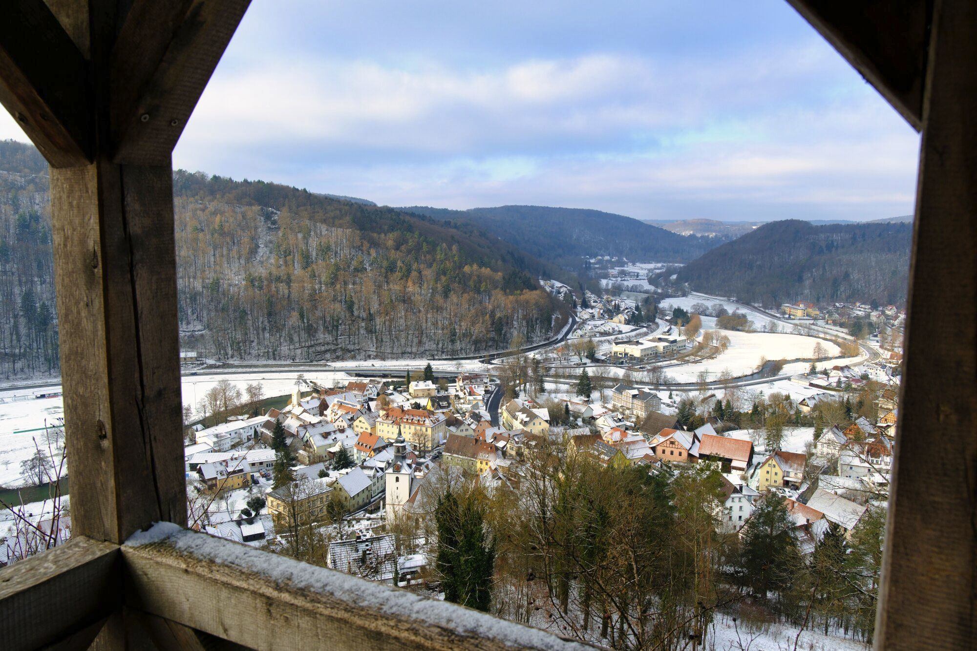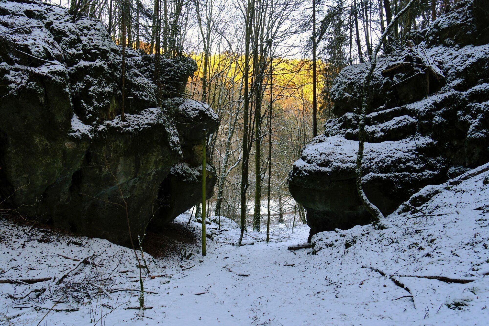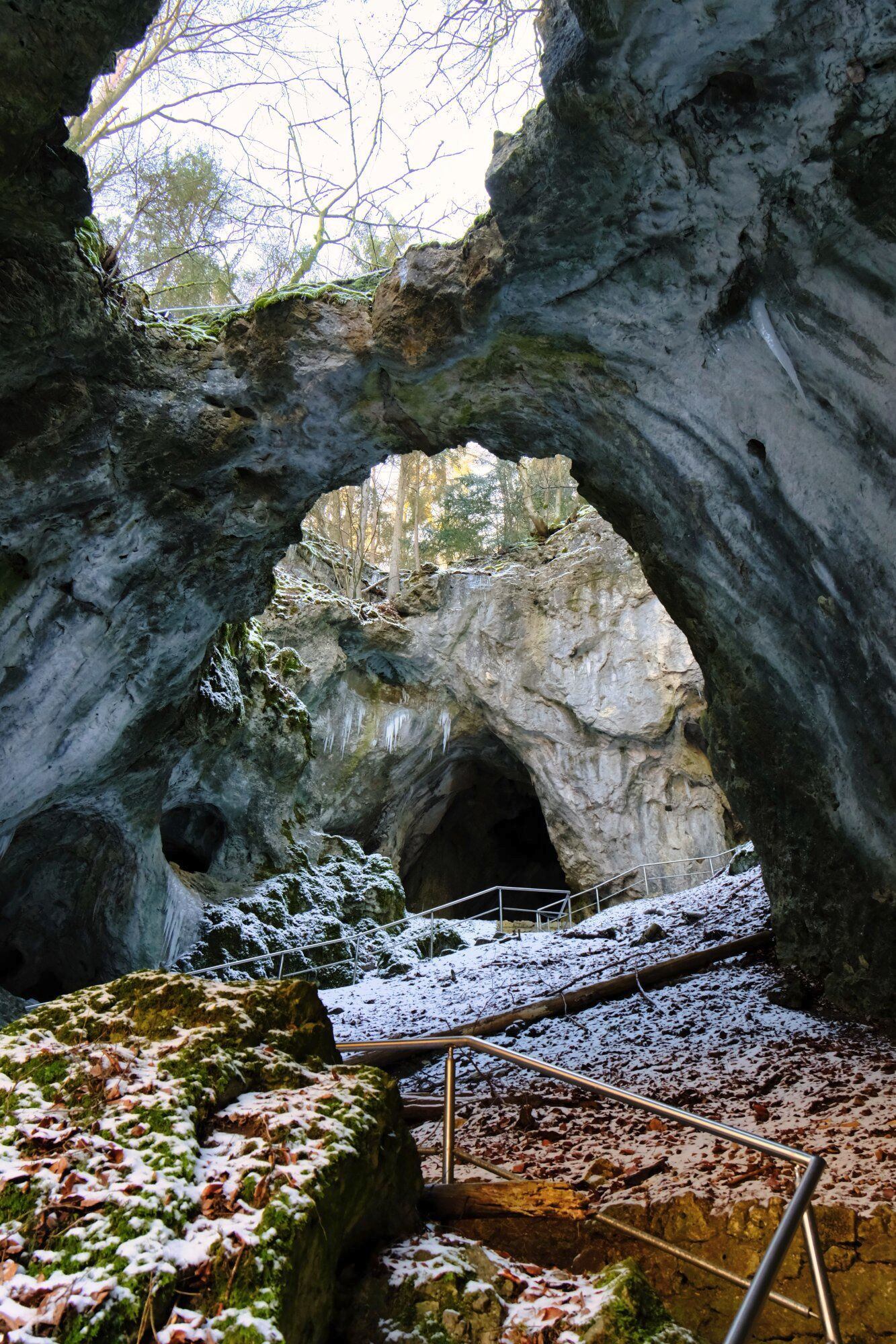 Vom Parkplatz geht es mit Rot-Senkrecht ein kleines Stück die Straße hinab und dann links über den Wanderpfad zum Pavillion und weiter zur Oswaldhöhle. Nach der Durchquerung über die Treppen nach oben, immer mal den Ausblick genießen und der Markierung und den Wegweisern zum Quackenschloss folgen. Über den Adlerstein geht es nach Engelhardsberg, hier wechselt auch die Markierung auf den gelben Ring. Durch den Ort und durch den Wald zur Riesenburg. Die Straße und im Anschluss die Wiesent überqueren und weiter nach Doos. Nun geht es an der Aufsess entlang bis zur Kuchenmühle. Diese durchqueren und durch die Bettelküche Richtung Albertshof. Der Wanderweg wendet sich kurz vor dem Ort nach links, am Waldrand an der Scheune vorbei, über die Straße und dem Radweg bis zum Parkplatz folgen.