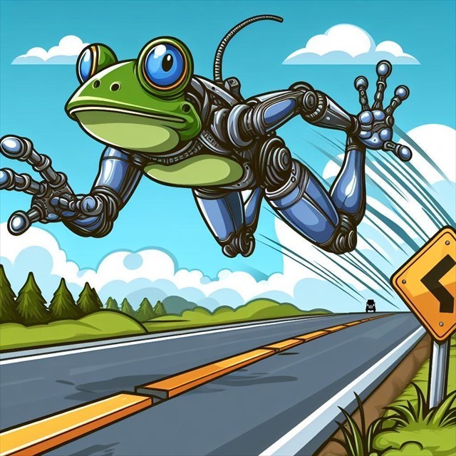 Once upon a time, there was a robot frog. Like most robot frogs, it would beep instead of croak. Robot frog was still afrog, even if it would let out abeep. Even though it would let out abeep, robot frog would leap across the street. But robot frog should be more careful when playing in the street, because coming up fast he can hear abeep, abeep, abeep!