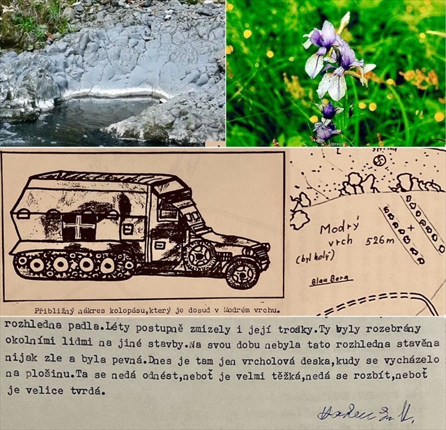 Fotografie kotle (hrnce) z videa Bobří soutěska (u nedalekých Verneřic) a chráněného Kosatce sibiřského, kresba a část mapky z textu Modrý vrch (nad blízkou obcí Valteřice), závěr strojopisného textu Strážný vrch (o bývalé rozhledně poblíž nedaleké obce Merboltice)