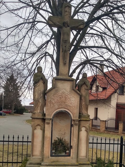 V ulici U Zvoničky stojí na ostrůvku s několika stromy kamenný kříž a dřevěná zvonička.