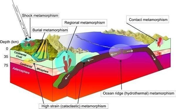 2. Burial under rocks and sediment – This type of metamorphism is called burial metamorphism. It affects rocks that are buried at great depth (more than 10 kilometers). These rocks are exposed to heat and pressure and their minerals are changed because of that.