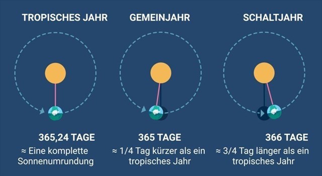 Unser Planet braucht im Durchschnitt etwa 365,242199 Tage, also 365 Tage, 5 Stunden, 48 Minuten und 46 Sekunden, für die Umrundung der Sonne. Diese Zeitspanne wird Sonnenjahr oder tropisches Jahr genannt.