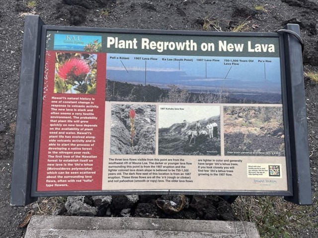 From this location - Three Lava Flows are visable. The darker an younger lava flow surrounding this point is from the 1907 eruption and the lighter coloured lava down slope is believed to be 750 to 1500 years old the dark flow east of this location is from an 1887 eruption these three flows. All of these flows are from the pressure breaks in the Southwest rift of Moauna Loa (rather then from the Cauldera of Kilauea in Volcano N.P. itself).