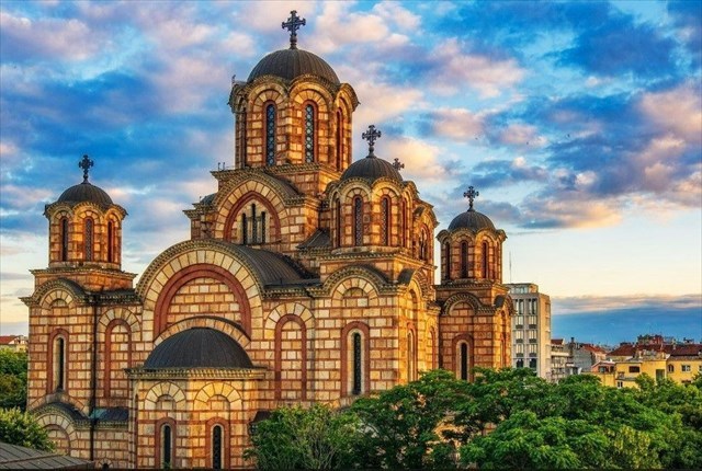 Located in Tasmajdan Park near Parliament, the Church of St. Mark is a Serbian Orthodox church built in the Byzantine style. The building you see today was mostly completed by 1940, but there was a church dating from 1835 on this same site. That original church was built of wood and also dedicated to St. Mark. It was built in an existing cemetery. Here, King Alexander Obrenovic I and Queen Draga Obrenovic were buried after they were assassinated during the May Coup in 1903. The original church was hit by German bombs and badly damaged on Palm Sunday in 1941. The rubble was cleared in 1942. At the time, the new church's exterior from sandstone had been completed, but finishing work was stalled due to the war. Nevertheless, divine service took place inside during the war. Officially, the building was consecrated in 1948. The church has three altars. One of the altars contains a mosaic that is believed to be one of the largest in the world, spanning 1,400 square feet (130 square meters). It is made of Venetian glass and is titled "Mother of God, Larger than Heaven."