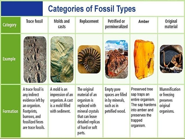 Types of fossils according to ways of formation: The fossils are classified according to the way of formation into several types which are the fossil of the complete body, The cast, the mold, and the petrified fossils.