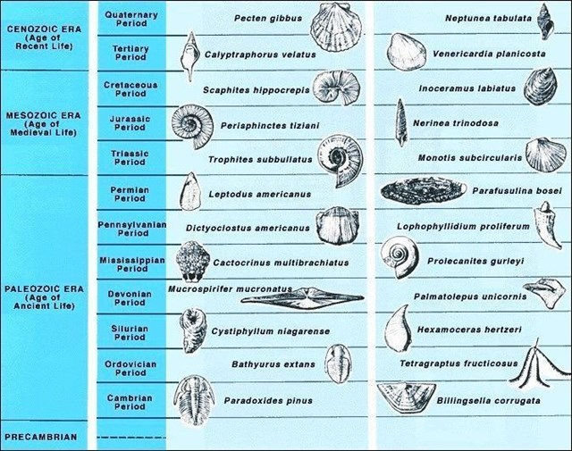 3. Према плавој табели у листи „Примери индексних фосила“ напишите ми тип фосила које сте пронашли у пешчару и историјском периоду.