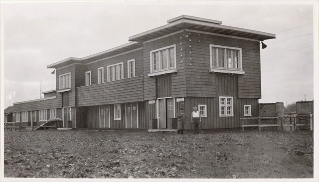 De zwart-wit foto laat het kantoor/werkplaats/opslag zien. De foto is genomen vanaf de Haarlemmerweg richting het zuiden. Op de locatie is er weinig meer te zien van het houten gebouw. Wel herkenbaar is het middelste stoepje. Zie de kleurenfoto.