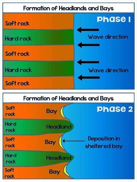 It is important to note however that this image represents a simplified version of reality. Several additional factors contribute to the formation of headlands, such as the presence of zones of weakness within the rock layers.