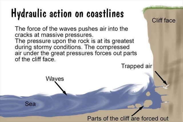 Hydraulic action occurs when waves crash against the rock, compressing air into cracks and crevices. As the waves retreat, the compressed air expands, breaking off pieces of rock.