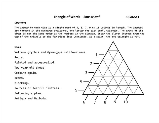The answer to each clue is a single word of 3, 5, 7, 9 or 11 letters in length. The answers are entered in the numbered positions, one letter for each small triangle. The order of the clues is not the same order as the numbers in the diagram. Enter the eleven letters from the top of the triangle to the far right into Certitude. As a start, the top triangle is “E”.
