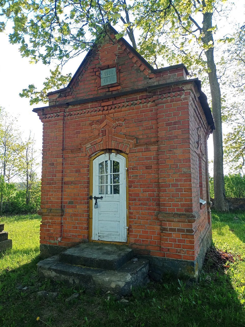 History: Leparskiene, a landlord, a small rural church, built from red burnt brick. The church is rectangular, just 3x4 m in size, like a large church layout. It had an altar on the walls of the walls. Two windows and one glass door. At the bottom is a basement. At the end of the basement is a box through which the coffin of Leparskienė with the remains was seen. When Leparskiene died, her mansion was immediately sold out.