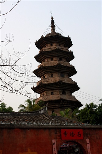 石塔,高35米,8角、7层楼阁式。采取迭涩四跳出檐法,用赤泥作粘合原料。立面造型古朴典雅,线条优美。
