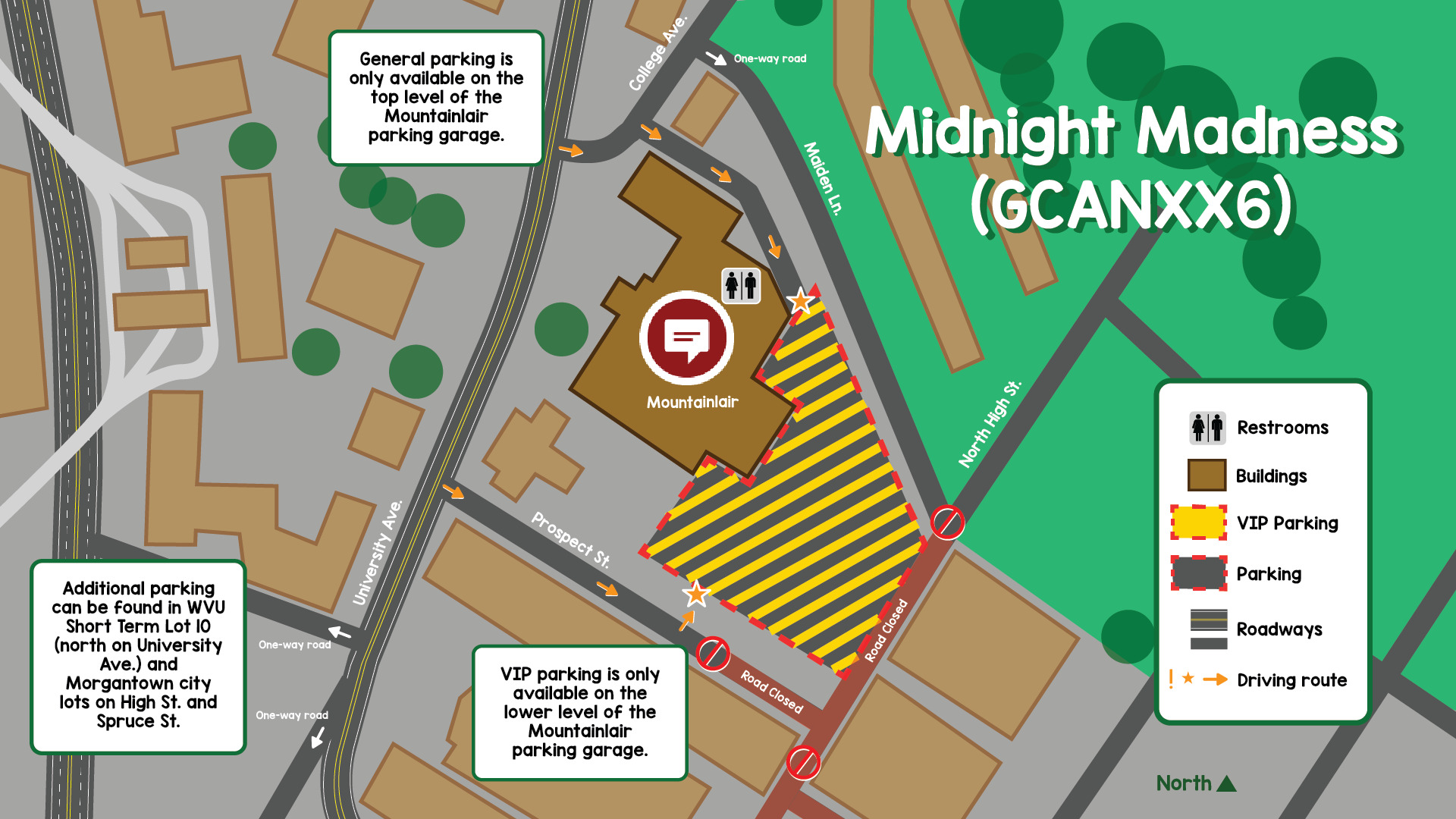 Parking. Parking for Midnight Madness will be located in the Mountainlair parking garage. VIP parking will be on floor 1, via Prospect Street, and general parking will be on floor 2, via College Avenue. Parking here is limited, and please exercise caution in the garage as it can be tight. A variety of other parking lots are available within walking distance of the event.