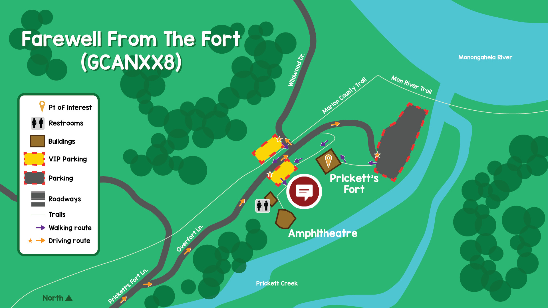 Final Farewell. (7 - 8 pm) Join us at the Prickett's Fort amphitheater for a last goodbye. Hear from the hosts, join in a Country Roads sing-along, and get an exclusive first look at the next BIG announcement for Geocaching. You won't want to miss this final celebration.