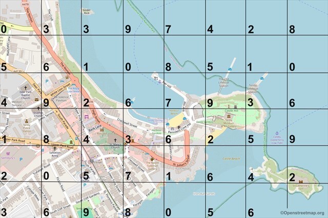 Each grid square corresponds to a number. Plug the number for each location into its corresponding letter in the code.