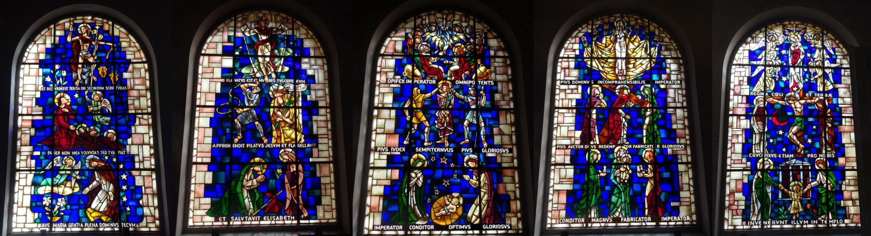 En ella destacan las vidrieras de un estilo de interpretación moderna del románico y que representan los misterios del Rosario, según un diseño del pintor Carlos Pascual de Lara.