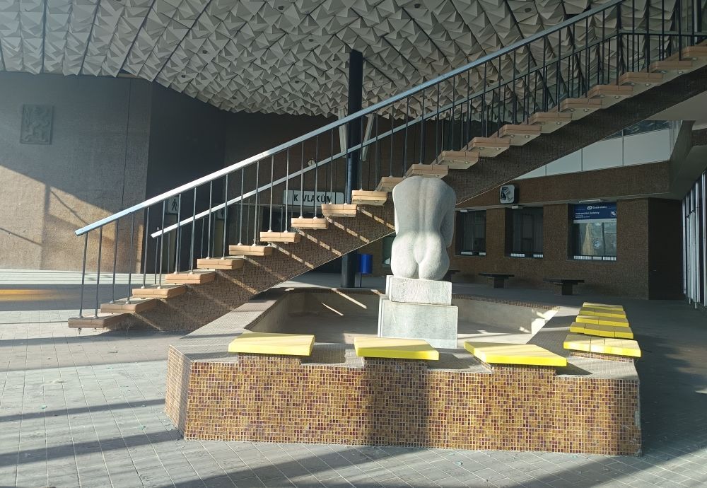 Nádražní budova je typickou stavbou tzv. "bruselského" stylu šedesátých let. Jedná se o půdorysně šestibokou stavbu skeletové konstrukce s pokladnami a restaurací. Dominantním prvkem bohatě prosklené odbavovací haly je jednoramenné schodiště. Strop je tvořený osnovou tří rovnoběžných svazků přímek, takže je dělený na trojúhelníková pole. Každé je opatřeno plechovým trojbokým jehlancem s různou mírou vyklonění. Při pohybu halou tak vytváří specifickou proměnlivou geometrickou estetiku. Perlou interiéru je pak původně květinový bazének s nahotinkou - socha "Opřená" je dílem sochaře Julia Lankáše. No, zadnici má výstavní!