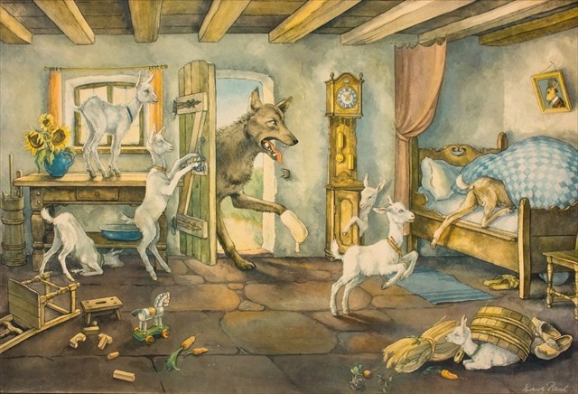 Es dauerte nicht lange, da klopfte jemand an die Haustür und rief: "Macht auf, ihr lieben Kinder, eure Mutter ist da und hat jedem von Euch was mitgebracht." Aber die Geißen hörten an der rauen Stimme, dass es der Wolf war, "Wir machen nicht auf", riefen sie, "du bist nicht unsere Mutter, die hat eine feine und liebliche Stimme, aber deine Stimme ist rau. Du bist der Wolf."